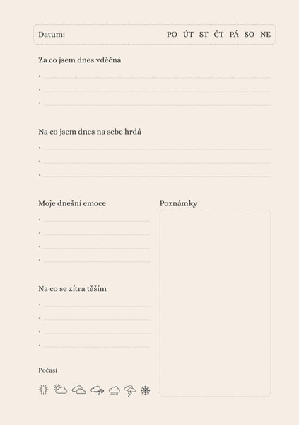 Deník vděčnosti ti pomůže každý den si uspořádat proběhlý den a uvědomit si, za co jsi vděčná. Kromě toho obsahuje otázky k hlubšímu zamyšlení nad tím, co je pro tebe v životě důležité. Součástí deníku jsou nálepky s obrázky „malých radostí“, které si nalepíš tam, kam se ti budou zrovna hodit. Deník vystačí na 6 měsíců.