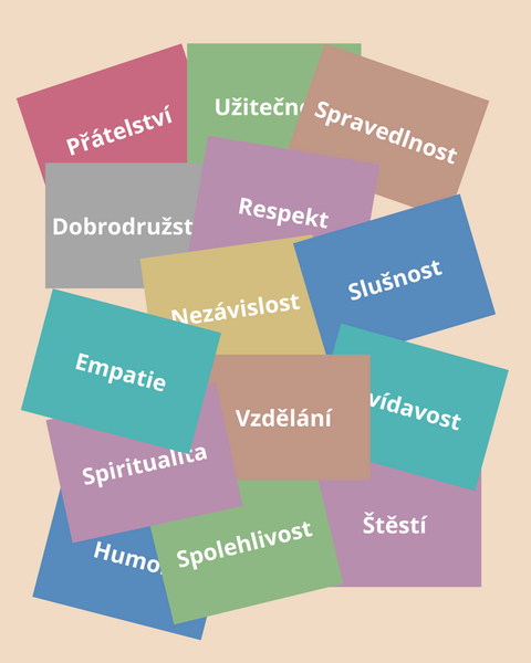 Karty s názvy různých hodnot je nástroj, který lze využít v psychoterapii, supervizi nebo koučování.