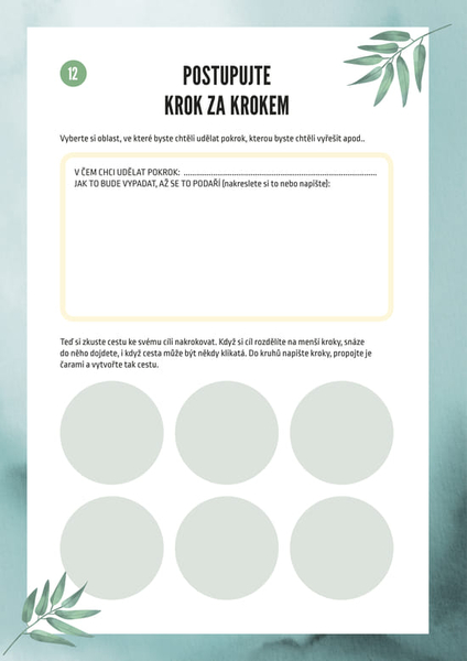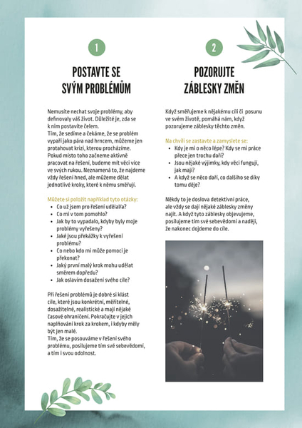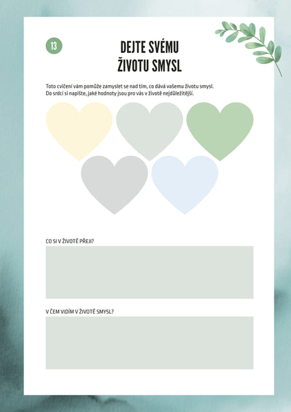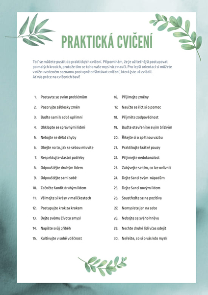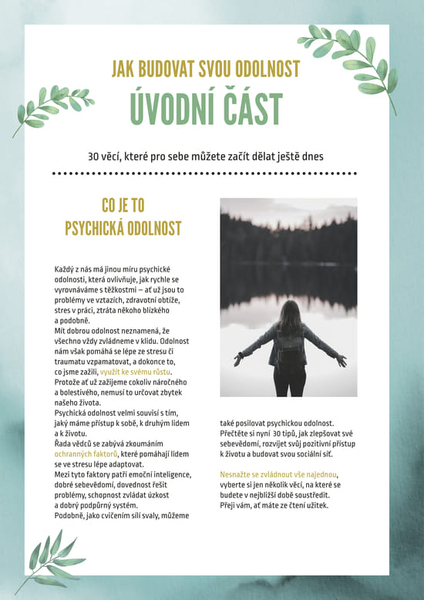 V pracovním sešitě najdete třicet cvičení pro zlepšení vaší psychické odolnosti. Mezi tématy cvičení najdete například: Buďte sami k sobě upřímní, Pozorujte záblesky změn, Přijímejte nedokonalost, Dejte šanci novým lidem, Nebojte se svého hněvu a mnohá další.
